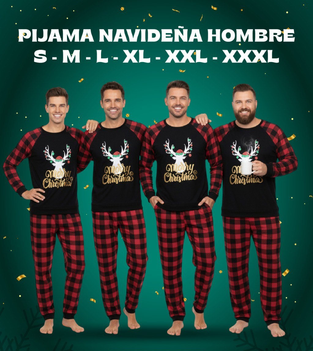 🎁 El Conjunto Perfecto: Camiseta manga larga negra con estampado navideño y pantalón largo con patrón de cuadros escoceses rojo y negro.